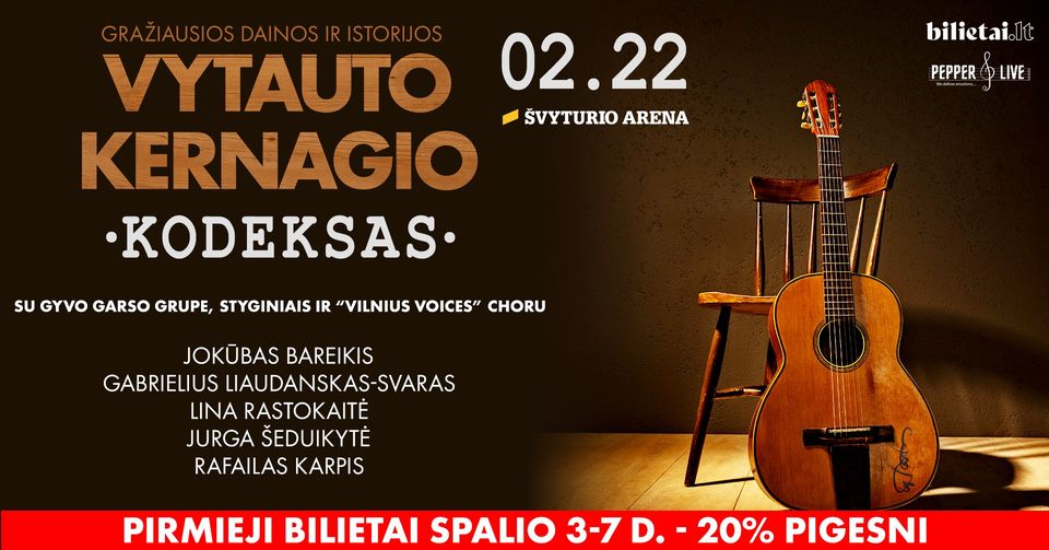 Bekannte litauische Schauspieler und Sänger – Jokūbas Bareikis, Jurga Šeduikytė, Lina Rastokaitė, Rafailas Karpis, Gabrielius Liaudanskas – Svaras und andere, die von den Veranstaltern später bekannt gegeben werden – sind zu den feierlichen Konzerten der schönsten Lieder und Geschichten aus dem „Codex von Vytautas Kernagis“ eingeladen. Die Konzerte, die in vier der größten Arenen Litauens stattfinden werden, werden nicht nur Erinnerungen an die geliebten Werke des Maestros der Nation wachrufen, sondern dem Publikum auch die Möglichkeit geben, noch nie zuvor gesehenes Archivmaterial aus dem Leben und Werk von Vytautas Kernagis zu sehen.