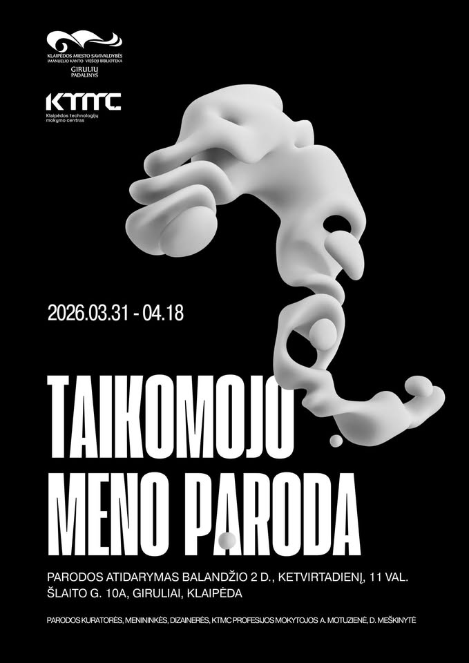 Donnerstag, 2. April 2026, 11:00 Am Donnerstag, den 20/20/2020, eröffnet die Stadtverwaltung von Klaipėda, Immanuel Kant Öffentliche Bibliothek, Zweigstelle Giruliai (Šlaito g. 10A) eine Ausstellung über Angewandte Kunst von Studenten des Technologie-Ausbildungszentrums Klaipėda. Kuratiert wird die Veranstaltung von den Künstlern, Designern und Lehrern A. Motuzienė und D. Meškinytė vom Klaipėda Technology Training Centre.