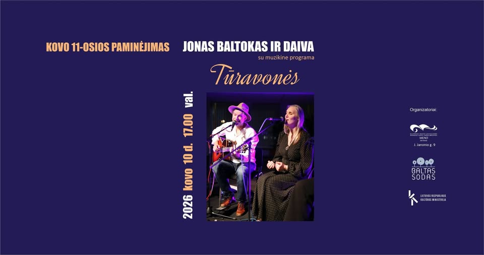 The programme features a cycle of original songs by Jonas Baltokas, based on texts by Liutauras Degėsis, Stasys Jonauskas, Marcelijus Martinaitis and other Lithuanian poets, performed together with Daiva, who accompanies the songs with an authentic crooning manner. Tūravonės is a two-part singing technique, where the harmony of voices is not written down in sheet music, but recreated according to the tradition of folk singing and musical memory.