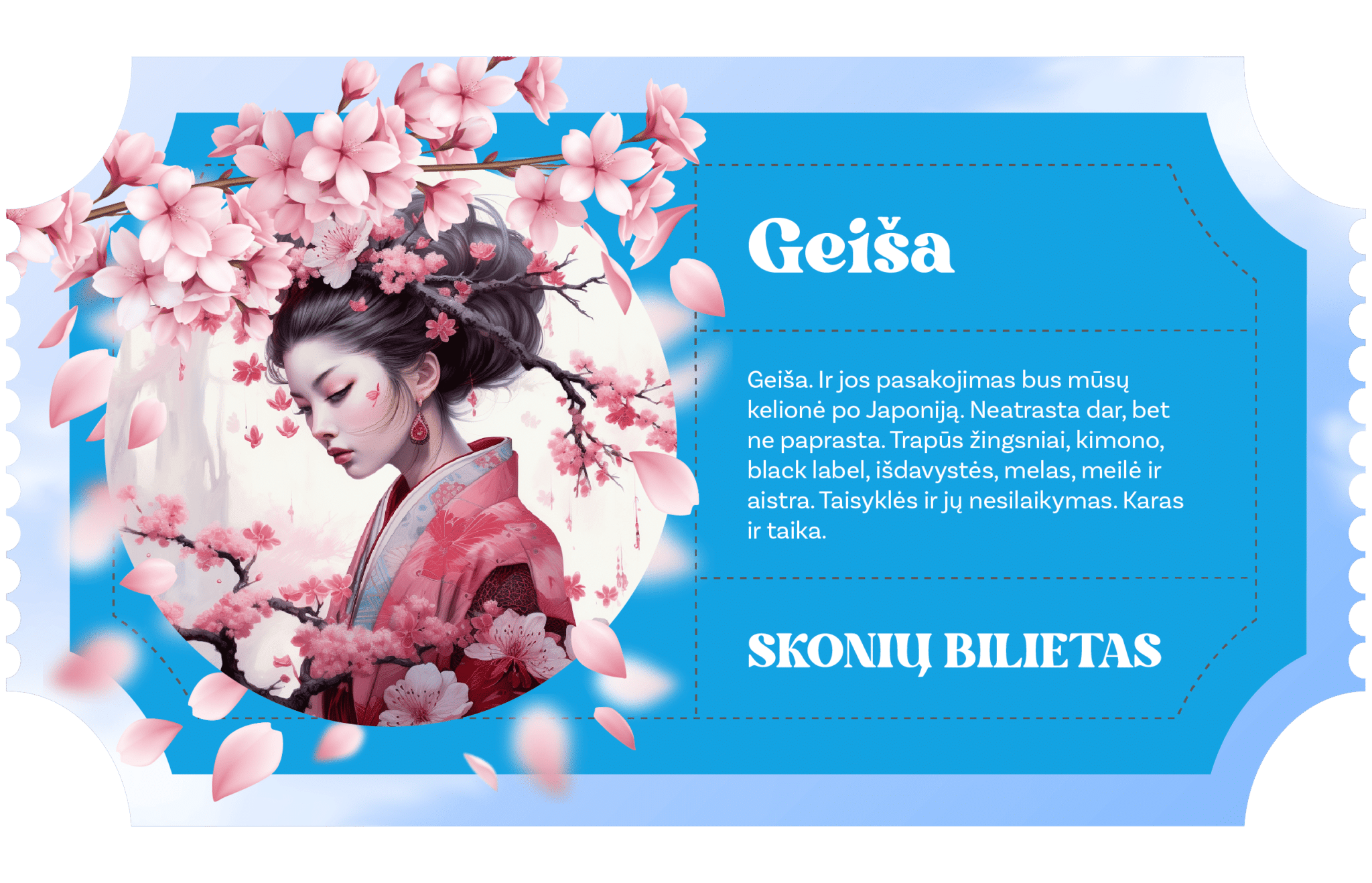 Pūga. Skustas ledas su japoniškų slyvų sirupu. Akys žydros, kaip ledas gėliausių vandenų užšalusių. Prigimtis. Grožiui, grakštumui ir nuolankumui. Ar prigimtis? Geiša. Ir jos pasakojimas bus mūsų kelionė po Japoniją. Neatrasta dar, bet neprarasta. Trapūs žingsniai, kimono, black label, išdavystės, melas, meilė ir aistra. Taisyklės ir jų nesilaikymas. Karas ir taika.