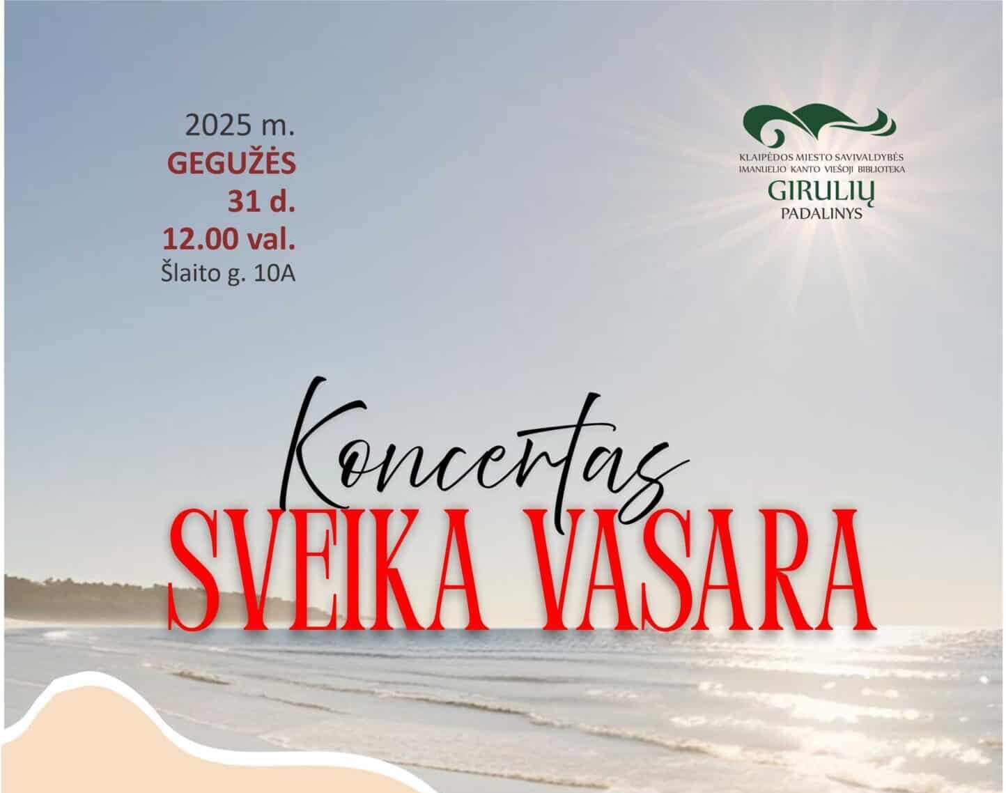 2025 m. gegužės 31 d. 12.00 val. Klaipėdos miesto savivaldybės Imanuelio Kanto viešosios bibliotekos Girulių padalinyje (Šlaito g. 10A) pasitiksime vasarą su koncertu „Sveika, vasara!“.