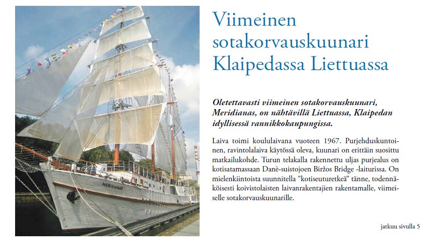 Straipsnyje pažymima, kad „Meridianas“, šiuo metu puošiantis Klaipėdos Danės krantinę, greičiausiai yra paskutinis išlikęs karo reparacijų burlaivis, pastatytas Suomijos meistrų, kilusių iš Koivisto regiono.