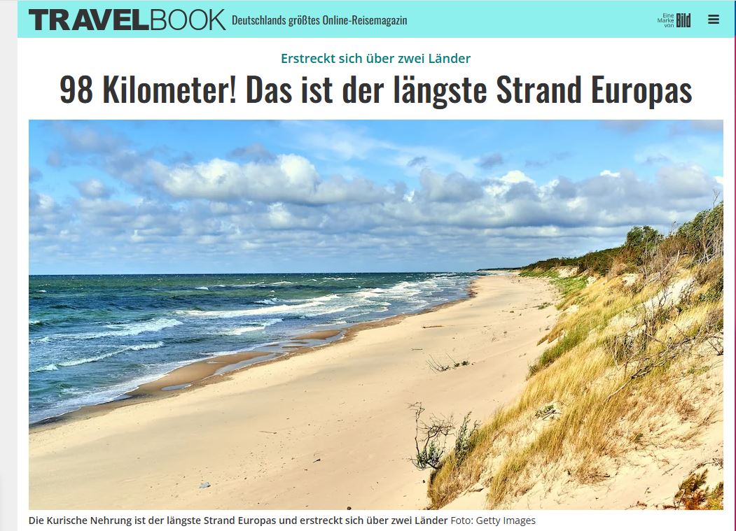 Kuršių nerija – ilgiausias paplūdimys Europoje – pristatoma Vokietijos kelionių portale Travelbook.de kaip unikalus gamtos reiškinys, kuriame susilieja laukinė Baltijos jūros pakrantė, smėlio kopos ir ramybė be masinio turizmo šurmulio. Straipsnyje pabrėžiama, kad ši siaura smėlio juosta, besidriekianti daugiau nei 90 kilometrų, yra viena įspūdingiausių ir geriausiai išsaugotų pakrančių.